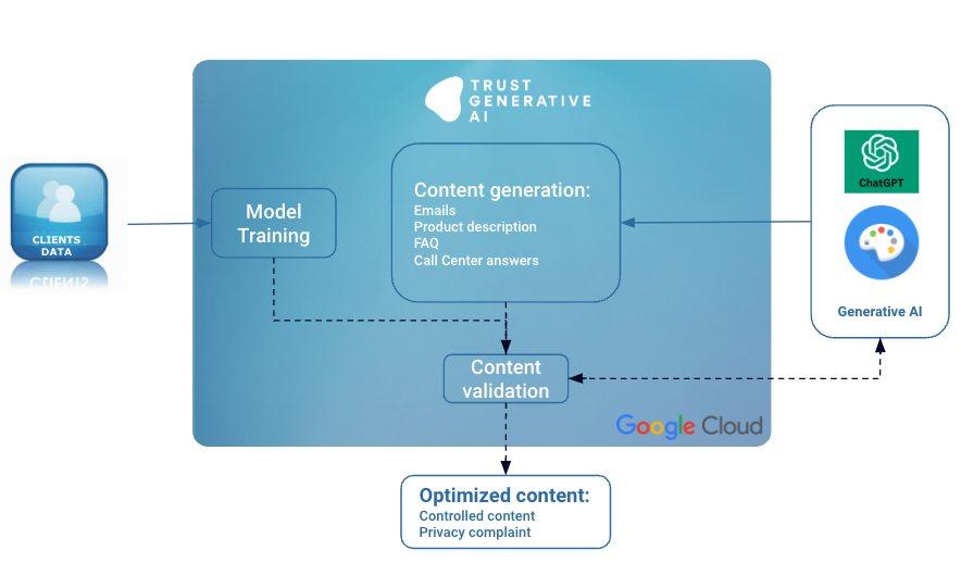 La plataforma, desarrollada sobre Google Cloud Platform y OpenAI, optimiza tanto el ciclo de los datos como el entrenamiento de los modelos de inteligencia artificial, y valida las respuestas obtenidas mediante modelos desarrollados en Google Cloud Platform sobre datos privados del cliente y datos más recientes no existentes en los modelos como GPT-3 y GPT-4.