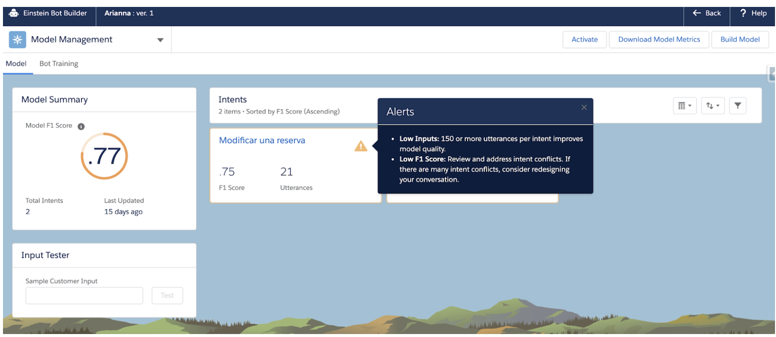 Entre sus funcionalidades, existe la opción de entrenar a nuestro bot para que entienda el lenguaje natural. Para ello, podemos seleccionar distintas intenciones del usuario y proporcionarle datos de ejemplo. Para obtener estos datos de ejemplo o de entrenamiento un procedimiento muy útil es trabajar con una primera versión del bot más rudimentaria que nos permita coleccionar información de las expresiones más comunes de los usuarios en relación a lo que quieren hacer con el chatbot. Para construir el modelo, Salesforce exige un mínimo de 20 ejemplos por intención y recomienda contar con al menos 150 datos. Evidentemente cuanto mayor sea nuestro conjunto, más eficiente será el entrenamiento de nuestro chatbot.