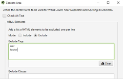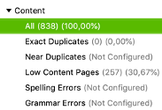 Dentro de “Contenido” la herramienta nos permite diferenciar entre “Contenido exacto duplicado” que nos mostrará qué páginas tienen el contenido exactamente igual y que puede provocar canibalizaciones y errores en el posicionamiento de la página. Pero la herramienta llega más allá, pues también nos puede facilitar las páginas que tienen el contenido muy similar y que sería positivo mejorar para atacar a keywords que no se estén trabajando. Estos dos filtros son muy interesantes, ya que nos permite ver en un vistazo una acción que en otras circunstancias podríamos tardar mucho en detectar, dependiendo del volumen de URLs de la web que analicemos. La herramienta también te permite afinar más la búsqueda con filtros en los que se añaden elementos HTML: