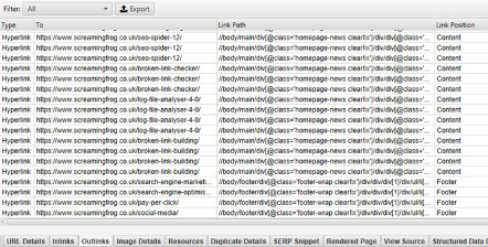 El equipo de Screaming Frog nos cuenta en la presentación de la nueva versión 13.0, que tenían muchas peticionas relacionadas con enlaces por parte de profesionales y han decidido mejorar esta sección, para que todos los que nos dedicamos al SEO podamos tomar las mejores decisiones. ¡Han escuchado nuestras plegarias y han creado nuevos atributos para los enlaces! Ahora se puede ver la posición del enlace dentro de la página, como por ejemplo si se encuentra en la cabecera, en el contenido o en el footer: