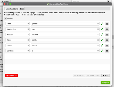 La posición en la que la herramienta te muestre dónde se encuentra el enlace dentro de la página se basa en HTML5, pero no todas las webs van a responder a este lenguaje, por lo que también nos dan la opción de configurar la “Posición de los enlaces” para que la herramienta sea lo más exacta posible.