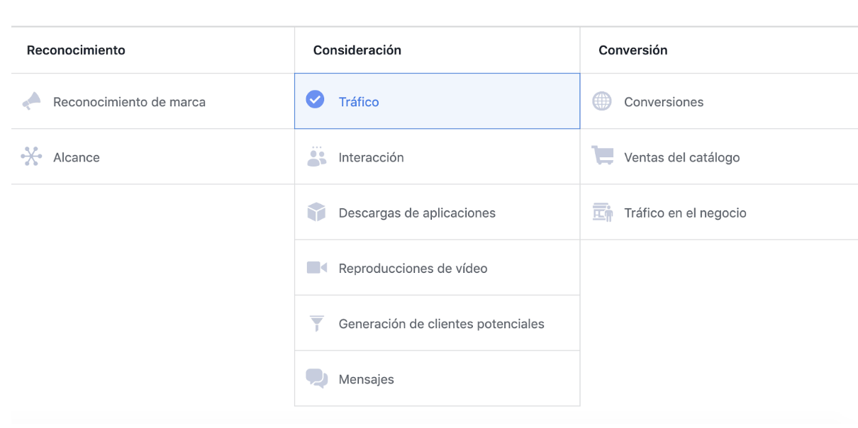 Para lograr ese cambio en nuestra estrategia, Facebook tiene diferentes objetivos de campaña que pueden sernos de utilidad. Normalmente, siempre usamos estrategias orientadas a la conversión final con ayuda de otras campañas que se extienden a lo largo del funnel. No obstante, en esta situación de crisis, podemos aprovechar para probar otro tipo de objetivos de campaña como el alcance, la reproducción de vídeo o los campañas de interacción.
