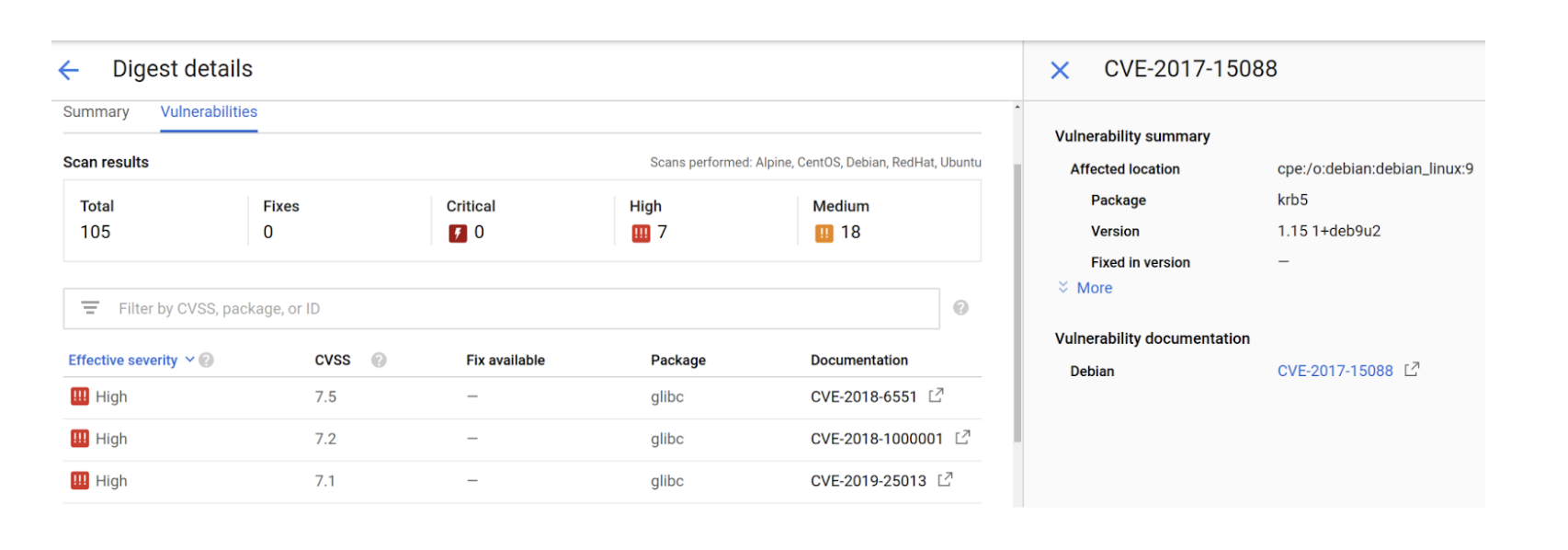 Para integrar la capa de seguridad en ese workflow de despliegue desde el inicio tenemos que realizarlo en el la herramienta de CI/CD que estemos utilizando, en este caso usaremos de ejemplo la nativa de GCP, Cloud Build. Hay dos etapas del esquema anterior en las que podemos aplicar tests de seguridad dentro del pipeline de despliegues automáticos, de verificación de código (con herramientas como SonarQube) antes de que ejecute el trigger de creación del contenedor o a la hora de crear los artefactos que se van a desplegar, en este caso contenedores. En esta última etapa es donde entra en juego el Container Analysis de GCP. Esta herramienta, que se puede utilizar bajo demanda o integrar directamente en tu pipeline de CI/CD, analiza el contenedor creado y guardado en Container Registry en busca de vulnerabilidades sacando un listado de ellas categorizado por gravedad.