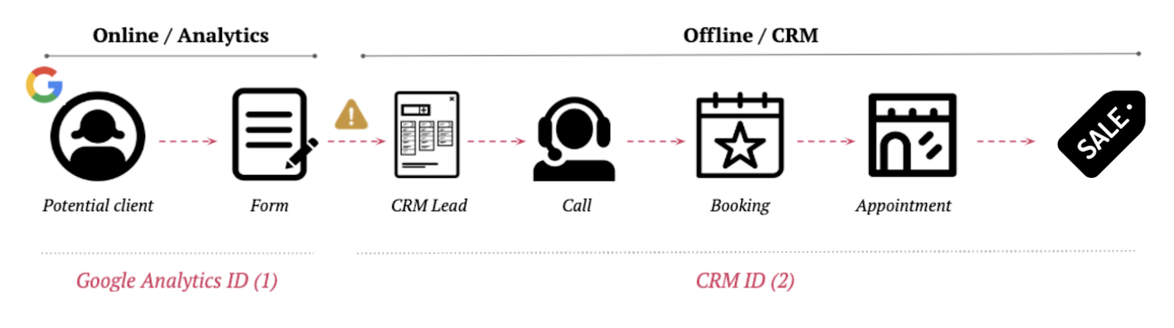 Veámoslo más claro con un ejemplo: un cliente potencial entra en tu site y termina enviando el formulario solicitando más información. Esta acción se registra en un CRM. En este momento se termina la experiencia online y si no hay una buena integración online y offline se acaba perdiendo el seguimiento del lead que ha enviado el formulario, ya que del CRM pasa la necesidad al call center, que le contactará para ayudar al usuario a avanzar en el funnel. Una vez realizado el contacto, si el usuario sigue en el funnel procederá a realizar una reserva, y posteriormente realizará la visita al establecimiento donde finalmente se producirá la conversión. En este ejemplo se están utilizando dos sistemas de medición de conversión, los cuales dificultan el seguimiento del cliente con lo que ello conlleva la dedicación de más recursos (tiempo y dinero, principalmente) para conseguir el seguimiento.