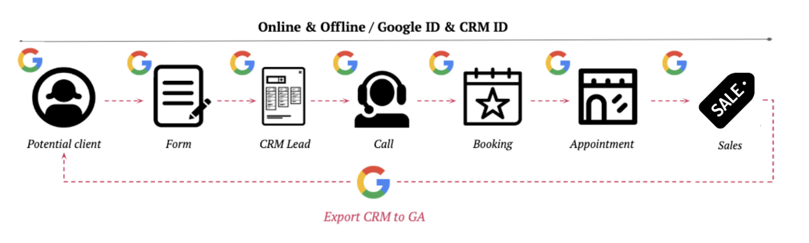 - Con CRM: veremos todo el customer journey del usuario en Google Analytics, matcheando GA ID con las ventas correspondientes que se registran en el CRM.