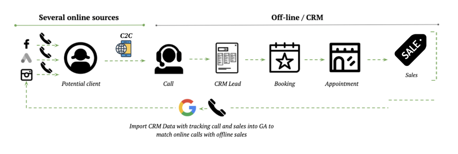 - Con Call-Center: Para trackear todas las fuentes de llamada online hay que implementar un sistema de tracking de llamadas con un número específico de teléfono para cada tipo de fuente.